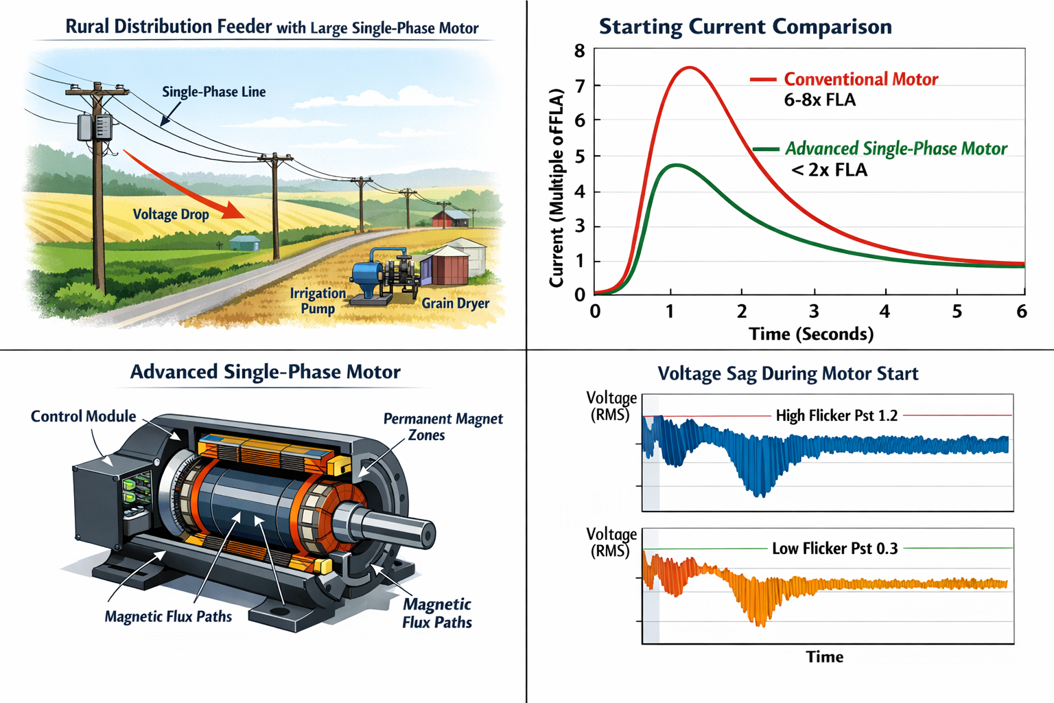 Advanced single-phase motors are designed to be uses where larger single-phase motors are needed and/or where the distribution has a weak short-circuit level, because they use technologies that overcome the traditional limitations of conventional single-phase induction motors — especially for high power (tens of HP) and weak rural grids. Please visit Selecting the Right High Horsepower Drive for Rural Settings for more information.