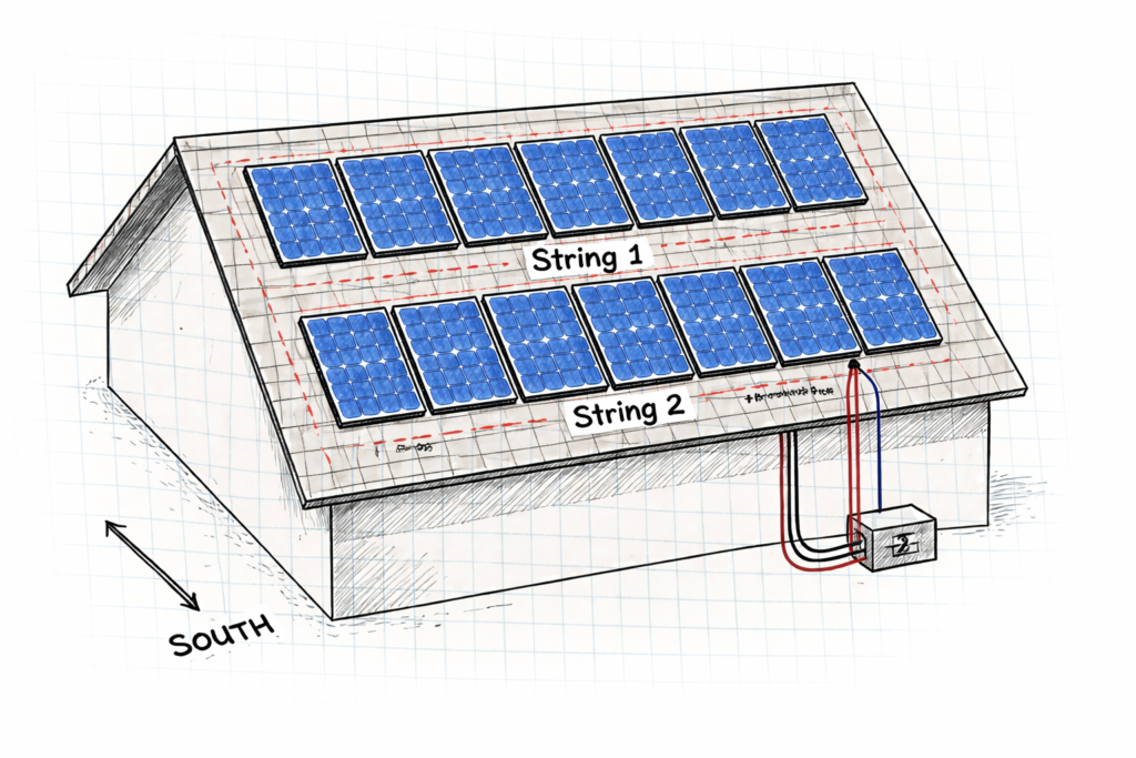- Solution: Keep both strings at 7 panels each for identical voltage and current.